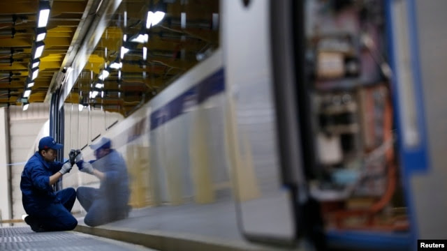 Công nhân làm việc tại một dây chuyền lắp ráp tàu ở Trung Quốc. 13 chiếc tàu điện của Trung Quốc mà Việt Nam tính mua của một công ty ở Bắc Kinh trị giá hơn 60 triệu đôla. Tàu mô hình sẽ được giới thiệu với người dân vào cuối năm 2015, và tàu sẽ được đưa về Việt Nam năm 2016.