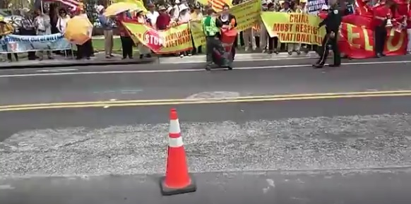 Một loạt người Trung Cộng ra đường mang cờ nền đỏ 5 sao vàng. Họ lao vào nhóm người Việt và Tây Tạng đang đứng biểu tình. Người Trung Cộng lớn tiếng thiếu văn hóa. Mặc dù bị khiêu khích nhưng người Việt đã cố gắng kiềm chế tránh gây bạo động với nhóm người Trung Cộng.
